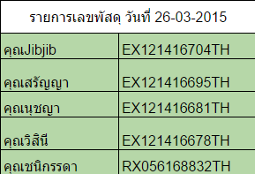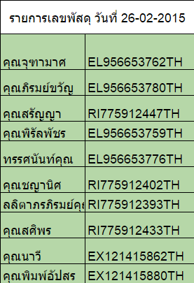 เลขพัสดุสินค้าวันที่ 26 กุมภาพันธ์ 2558