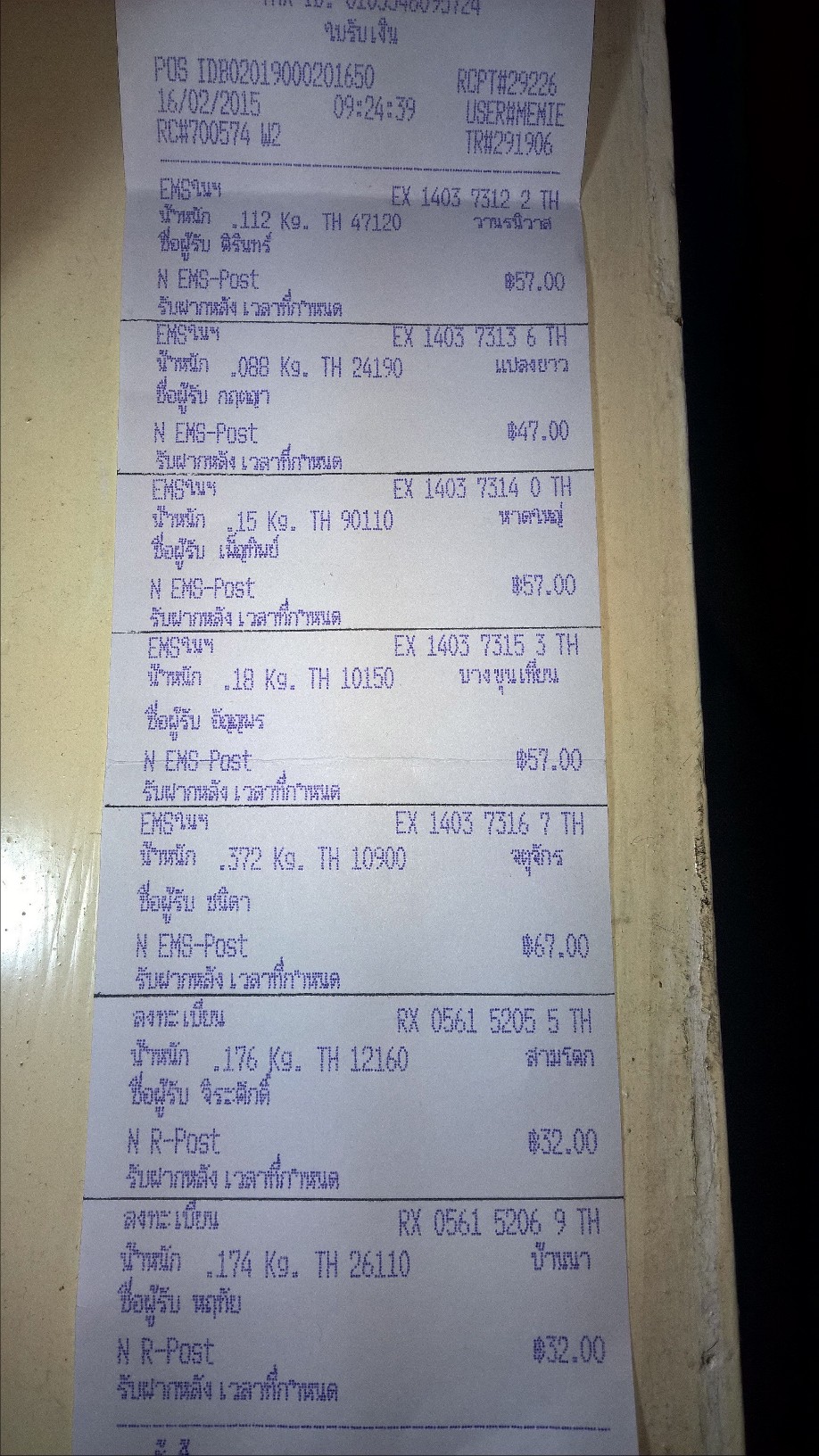 เลขพัสดุสินค้าวันที่ 16 กุมภาพันธ์ 2558