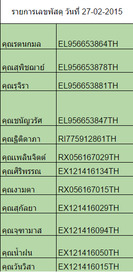 เลขพัสดุสินค้าวันที่ 27 กุมภาพันธ์ 2558